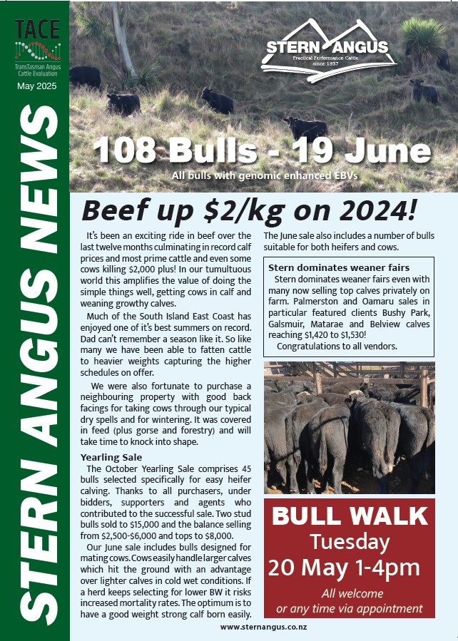 The Stern Angus bull sale, held on Thursday 23rd June, was a record breaker with 101 bulls rattling through the ring to a New Zealand high price for the season to date of $47,000 and an average of over $9,500. It was a total clearance of the 101 bulls offered at the 48th Annual Sale and was a terrific way to celebrate eighty years in the seed stock industry by the Fraser family.